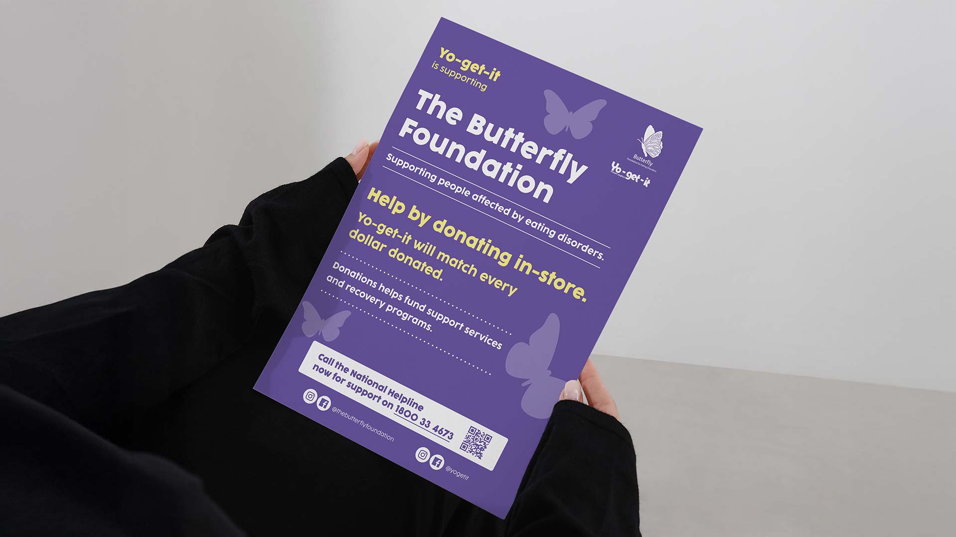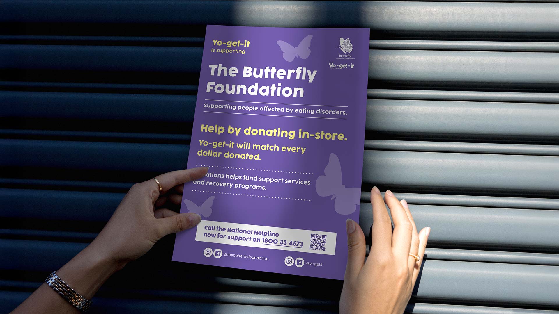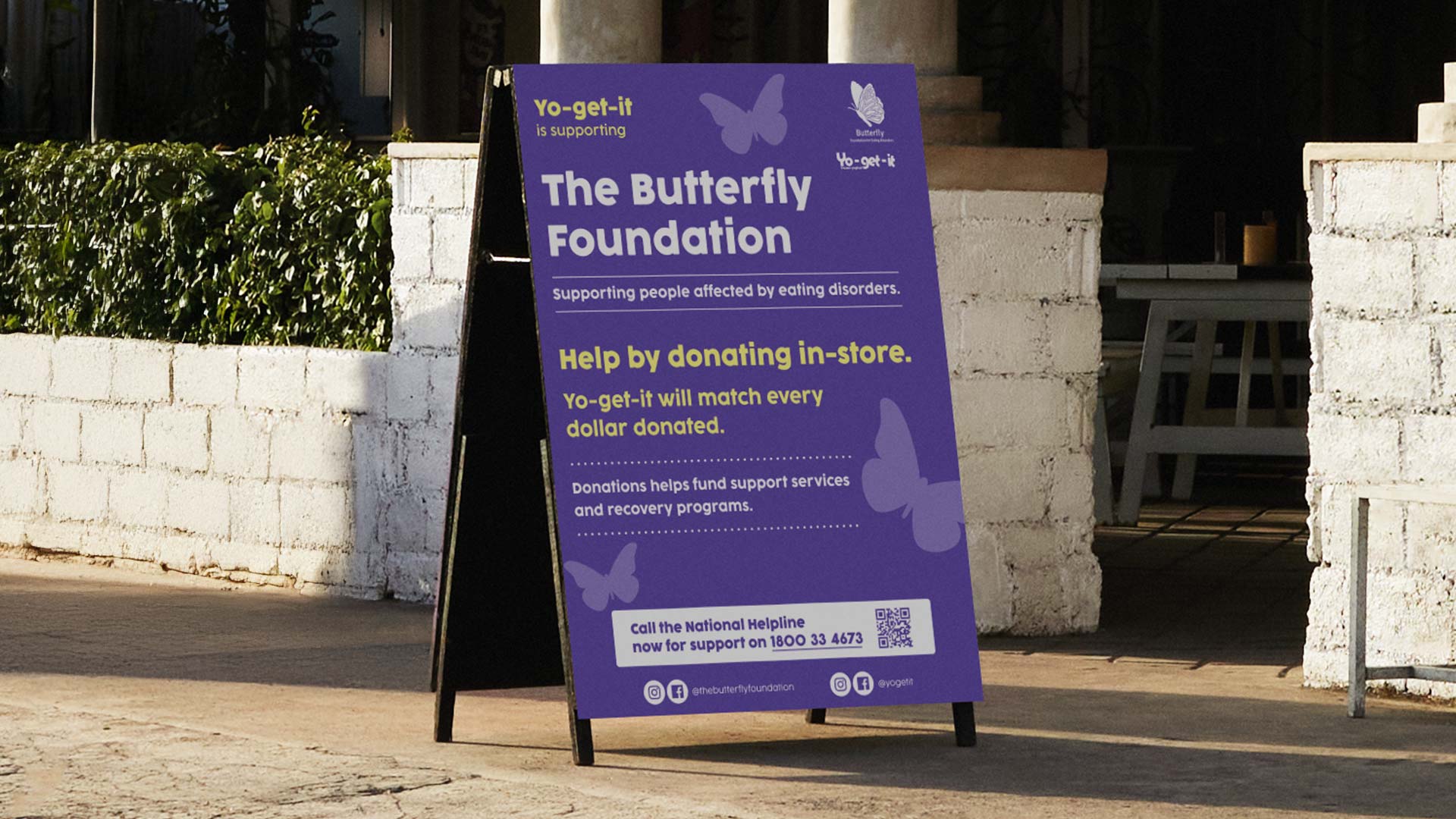 Yo-get-it Frozen Yoghurt partnered with The Butterfly Foundation to raise awareness around eating disorders, which are highly stigmatised psychiatric illnesses that often go unspoken. The goal was to educate the public, encourage help-seeking behaviour and support fundraising efforts.