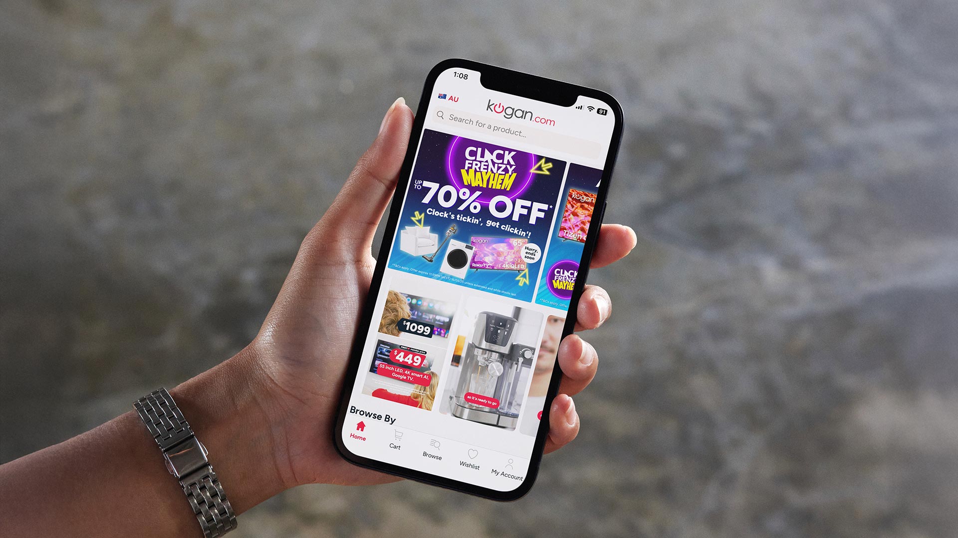 Kogan.com partnered with Click Frenzy for the national Mayhem event and needed campaign creative that combined both brand identities without losing the character of either. The promotion required a large volume of assets delivered quickly, and the visuals needed to work across homepage placements, eDMs, mobile and social media.